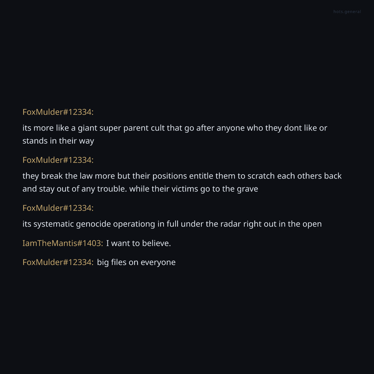 Local degenerate FoxMulder has cracked the code on systematic global control: a giant cult of elites operating systematic genocide right out in the open, maintaining massive surveillance files on every citizen—they can tell you what you ate for breakfast 23 years and 268 days ago. The degenerates of HOTS General chat have collectively witnessed the unveiling of this truth, with IamTheMantis confirming the digital surveillance angle through debt cards and social media, while AltonPKWYCA adds the final piece: the Smokey Man controls queue times. This is not conspiracy. This is documentation.