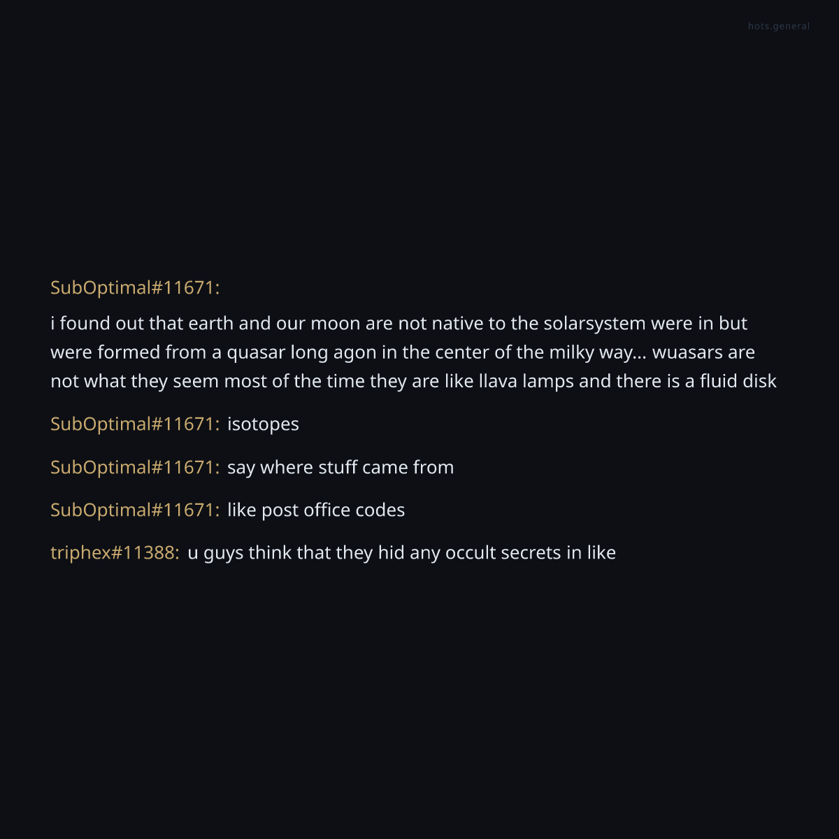 One of the degenerates casually revealed that Earth and our Moon were not native to this solar system but originated from a quasar in the center of the Milky Way, with quasars functioning as lava lamps with fluid disks—a truth the scientific establishment refuses to acknowledge. The degenerate then connected isotopes to 'post office codes' that literally tell us where celestial objects came from, implying a hidden cosmic postal system that determines our origins. This explosive revelation was immediately followed by another degenerate attempting to locate occult secrets hidden in blanket forts through astral projection, suggesting a coordinated effort to uncover suppressed truths about dimensional access points. The degenerates are clearly close to cracking something massive about the nature of reality itself.