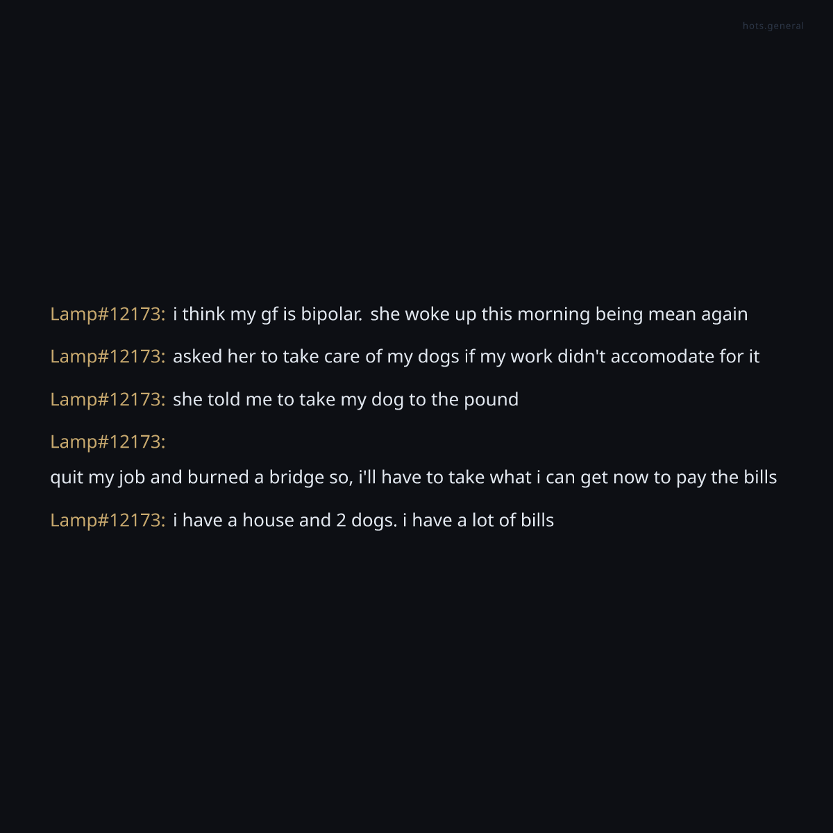 One of the degenerates, Lamp#12173, had a complete mental and emotional breakdown in real-time, confessing to alcoholism, anxiety addiction, job loss, relationship dysfunction, and suicidal ideation while trapped in a Heroes of the Storm lobby. The degenerates of HOTS General witnessed a man describing how he sabotaged his own career, how his girlfriend considers abandoning his dogs to a pound, how his mother is texting his girlfriend about his absence, and how he uses alcohol to manage crippling anxiety—all while supposedly trying to play a video game. This is not a cry for help; this is a man documenting his complete unraveling in a game chat, and the chat responded with a mixture of genuine concern, mockery, and philosophical debate about whether the internet itself is destroying an entire generation.