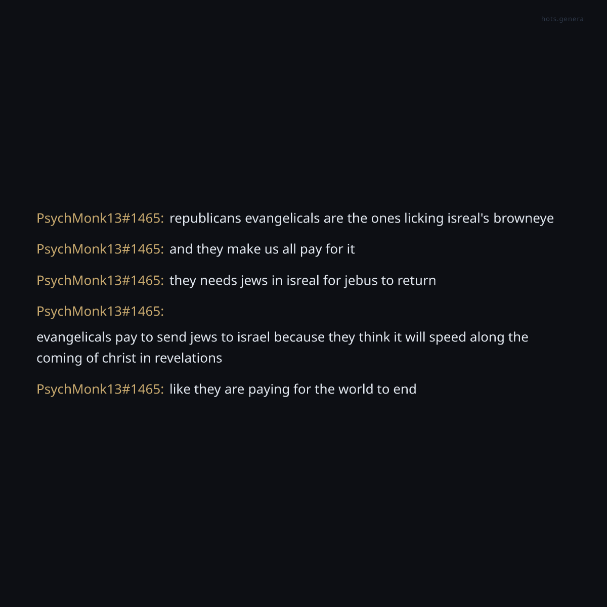 Local degenerates have uncovered the TRUTH about Christian Zionism and evangelical endtimes theology — they are literally funding their own apocalypse through Israel support, convinced it will trigger the rapture. One of the degenerates connected the dots: evangelicals aren't just politically aligned with Zionism, they're actively accelerating eschatological events by bankrolling Jewish resettlement, making them unwitting participants in a doomsday cult mechanism. The implications are staggering and nobody in mainstream media will touch it.
